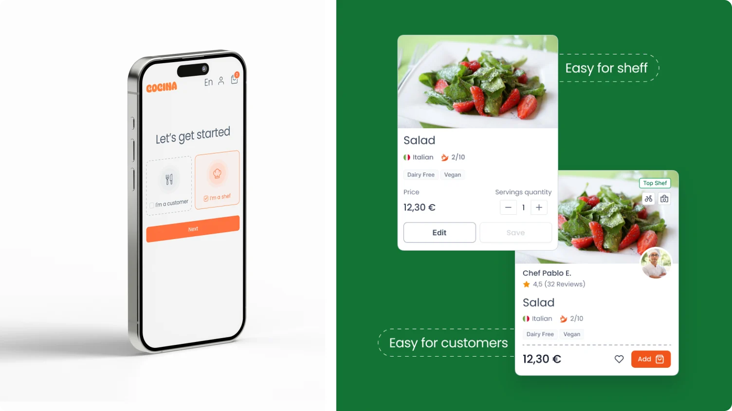 Cocina is a Spanish food delivery platform designed to bring authentic national dishes to users by connecting them directly with talented chefs. The platform provides a seamless and enjoyable dining experience by allowing customers to browse various chef-created dishes, place orders, and enjoy meals delivered to their homes. Unlike traditional food delivery services, Cocina emphasizes the connection between professional chefs and food enthusiasts, offering a platform highlighting culinary expertise and authenticity. Customers can access a wide range of high-quality meals from worldwide cuisines. At the same time, chefs can manage their menus and orders through the platform, creating a unique and dynamic food delivery system. We are proud of the food delivery app development services we’ve provided here.